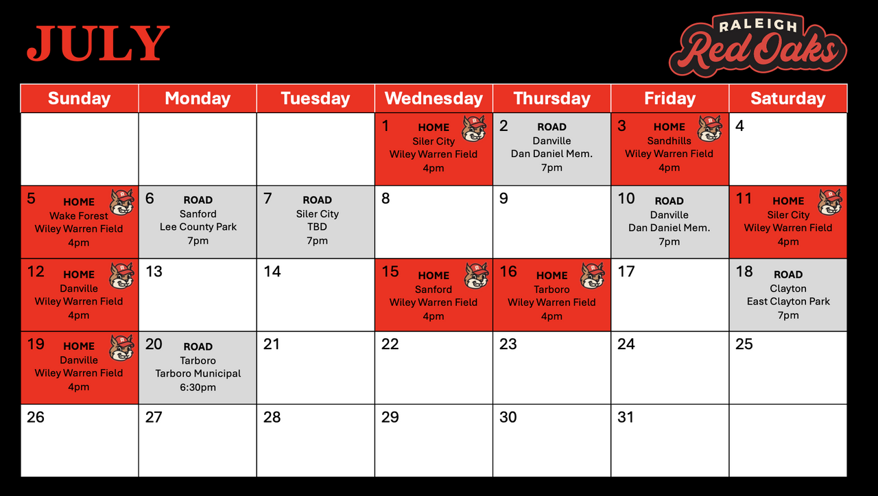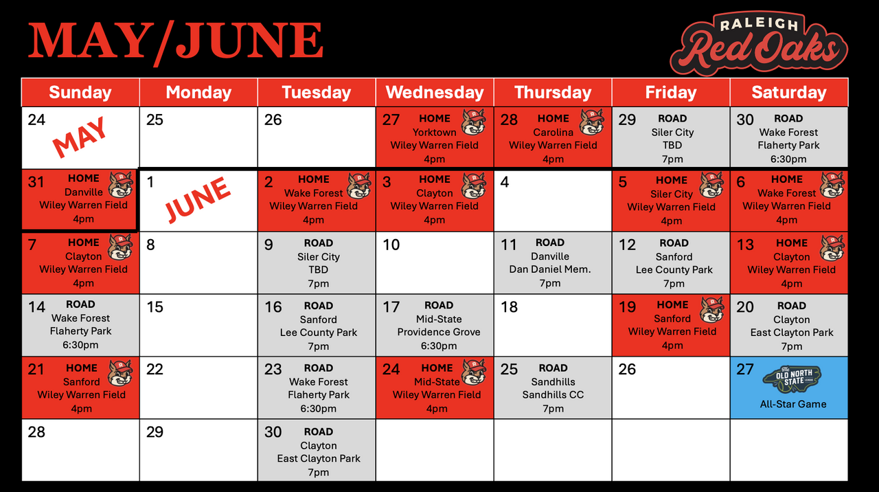 The Raleigh Red Oaks are officially gearing up for an unforgettable summer as we release our full 2026 season schedule! This year’s slate features 38 total games, including 20 home matchups at our new home, Wiley Warren Field, where fans can expect an electric atmosphere all season long.
